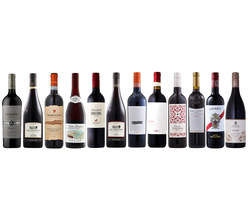 This Mixed 12-Pack Pre-Selected Dozen of Imported Red Wines contains one bottle each of the following wines: